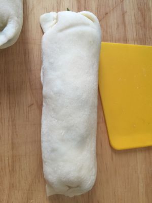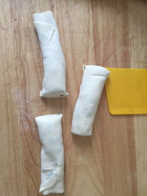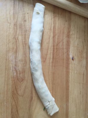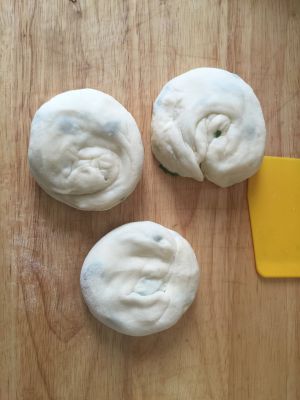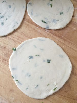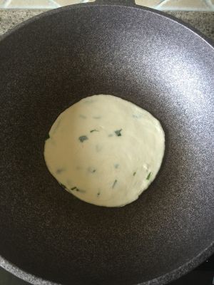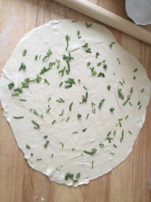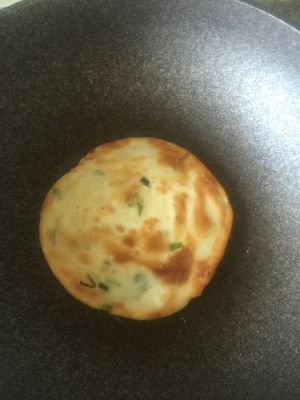 面团做成长条饼,涂上葱油,卷成条,卷成圈,再擀成饼,放在煎锅上。我没有电饼铛,只好用煎锅
