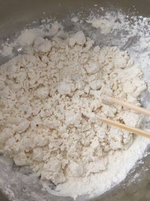 水烧开画圈的方式倒入面粉中,边倒水边用筷子搅拌均匀成絮状。