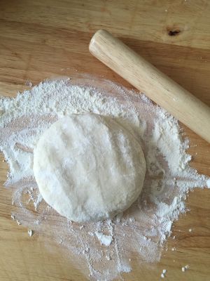 饺子皮重叠处用勺子背面抹上油酥,压好。
