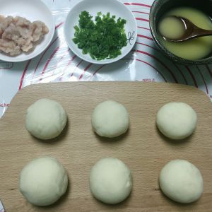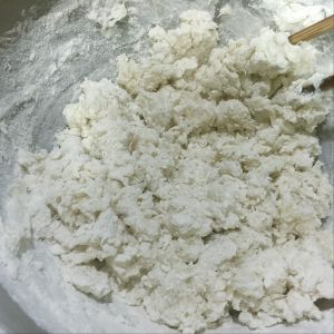 把面粉加少量豆油边加凉水边用筷子搅拌成抱团状。 然后把面揉成团饧一饧备用。注意面要活得软一些