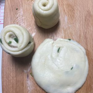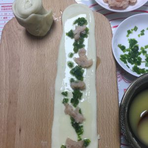 面团搓成长条后压扁,刷油酥,放葱和肉糜,卷起来。