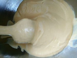 打发好的淡奶油加入蛋黄糊。
