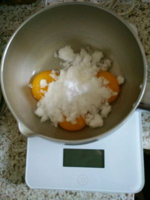 取三个蛋黄加入棉砂糖打发