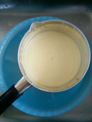 搅拌到蛋奶糊变得稠稠的关火,放入冷水中降温备用