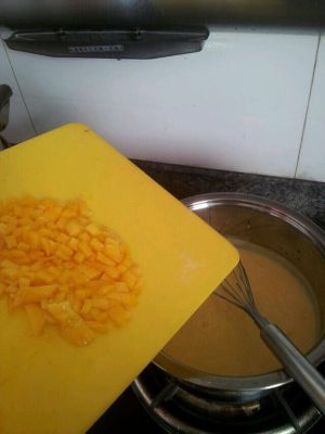 牛奶里加入芒果泥,加热
