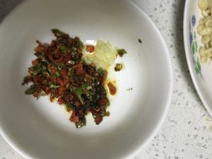 2、在油锅里倒入二茶匙植物油,一小茶匙香油烧至七成热浇在葱花上制成葱油。为了让辣椒出味,我把辣椒也同时放入油中爆出香味再淋上葱花碟上;