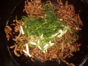 起锅烧油,放入葱姜辣椒段,爆香,放肉丝翻炒