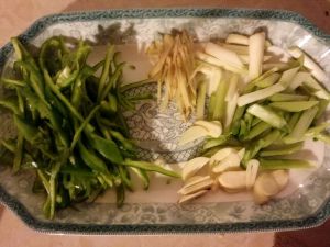 青椒切丝 蒜切片 姜切丝 葱头切段
