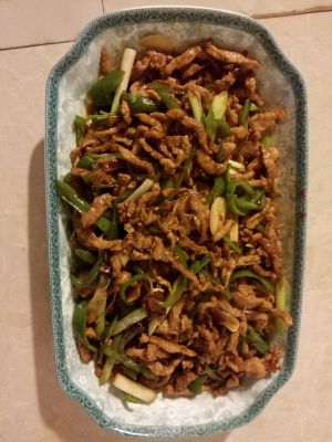 下先炒好的青椒 切好的葱姜蒜 翻炒几下 在放点白糖起锅
