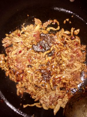 瘦肉切丝 放郫县豆瓣 淀粉 酱油 鸡精 花椒油 搅拌均匀