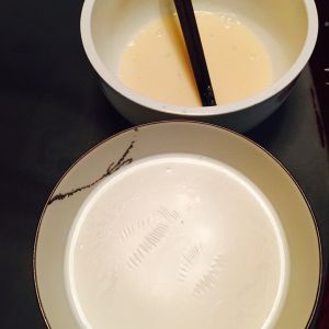 待小碗中牛奶表层凝结成厚实的奶皮,掀起奶皮一角,缓缓地将小碗中的奶液倒入大碗中,使小碗中的奶皮留在小碗底部。
