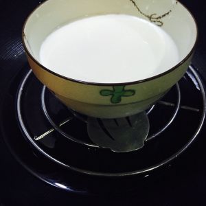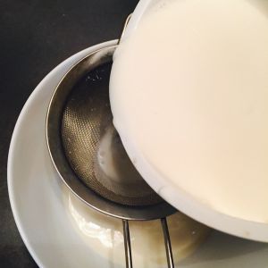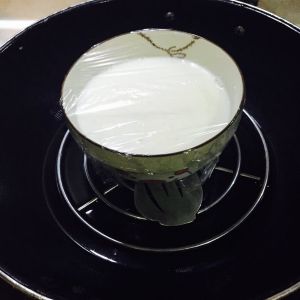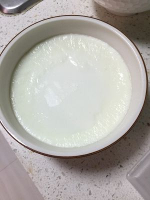 蒸热后冷却的牛奶倒入碗中~ 记得保留奶皮在碗中(我的奶皮溜了)
