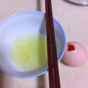 拿一个空的大碗中放入二只蛋清(蛋清蛋黄分离的方法想必大家都会的,就不多说了)、二勺糖,搅匀至糖溶解(不要打太久,否则变蛋泡