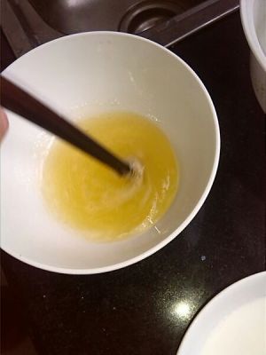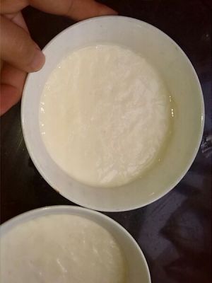 这时牛奶上面已经起了皮 将皮戳破 把牛奶缓缓倒入另一个碗内 记得剩一点牛奶