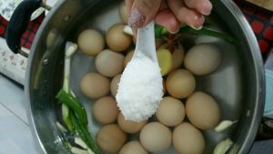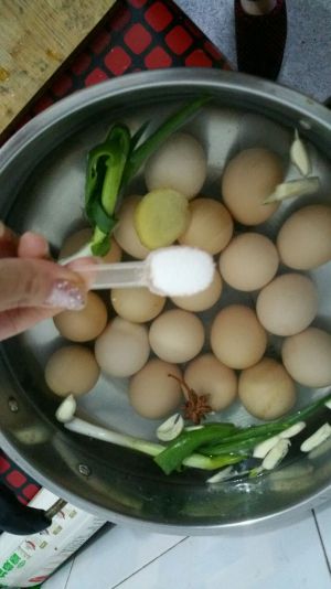 将蛋捞出,把所有的调料称好重量,放入锅里大火煮开,用小火烧3分钟,让味道进入水里