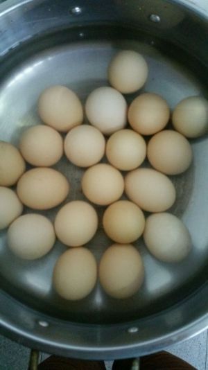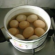 鸡蛋捞入盆内,加凉水冷却后剥皮。(锅内的水倒掉)