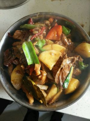 鸡肉土豆基本熟透,此时放青椒,洋葱翻炒后炖2分钟,撒葱花,出锅。 可提前煮好宽面条铺与盘底,放入菜,大盘鸡就做好了。