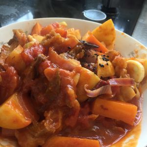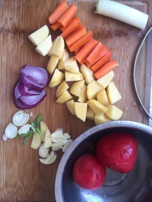 准备的食材,切成均匀的大小块,西红柿去皮,不好扒皮可以在头上割十字刀放热水里烫下皮就卷起来了