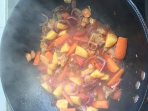 把土豆胡萝卜牛肉圆葱全部放进去,倒入酱油,翻炒片刻,放刚才煮牛肉的汤