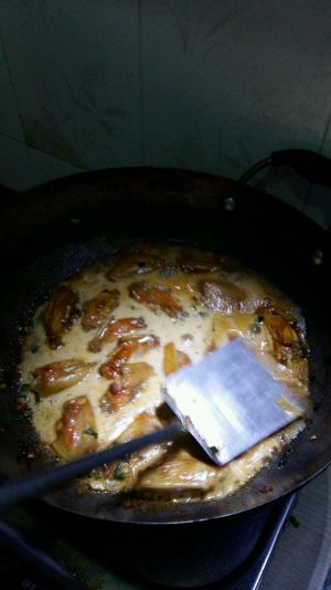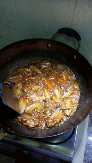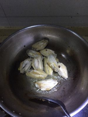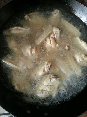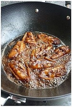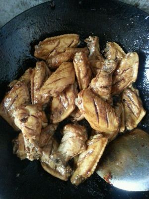 锅加油烧热,鸡翅倒入,小火煎制至金黄。