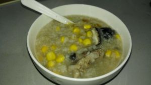 先将排骨洗净,用水焯一次,然后放入砂锅内,加入开水适量,再加入洗净的玉米粒与撕碎的鲜香菇即可。盖上盖子小火煲3个小时。煲汤的同时将大米用冷水浸泡,便于快速将粥煮开花。