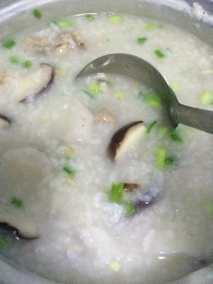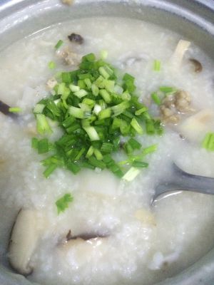 排骨煮开后,把山药倒入,大米倒入,一起煮,半个小时后,把香菇倒入煮…等大米煮开花,粘稠,香菇煮熟,倒入准备好的葱花…加入适量盐,鸡精…
