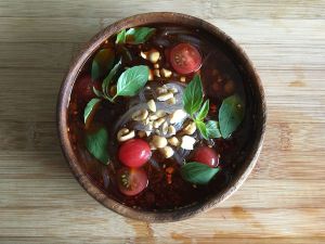 在碗里加些煮粉的开水,在加入生抽2勺、陈醋3勺、辣椒油1勺、熟花生仁1勺、熟芝麻1勺、芝麻油1勺以及3勺炒好的肉末。最后放入熟花生碎和熟芝麻,放几个小切开的小番茄装饰一下,青菜可以根据自己的喜好来定。我放的是荆芥,大家也可以放香菜或是小葱。