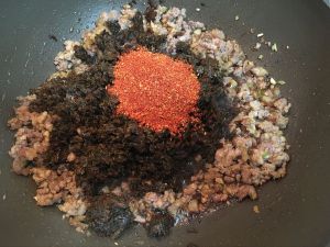加入碎米芽菜和打碎的干香料混合物翻炒2分钟左右。