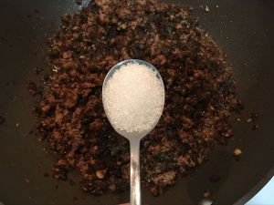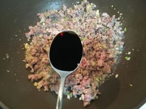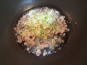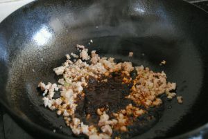锅里放比日常炒菜多2倍一些的油炒肉末,肉末炒熟后入葱姜蒜末在加半勺盐即可。