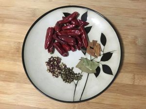 准备干红辣椒,香叶、桂皮、花椒和藤椒。
