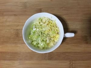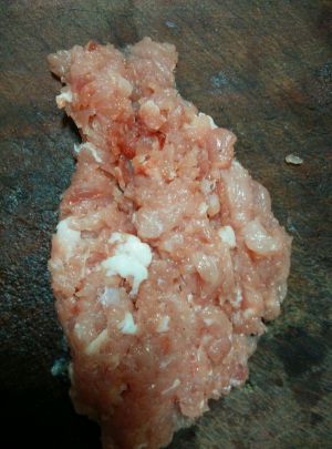 其实用猪肉糜最好,我是临时起意做的 猪肉来不及解冻,就用了培根,切成细丝儿