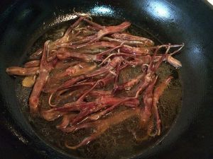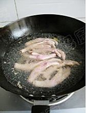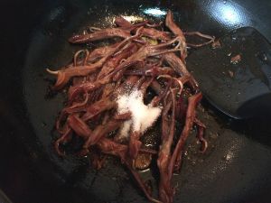 油温6成热时,下鸭舌翻炒几下,放入盐。