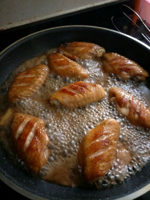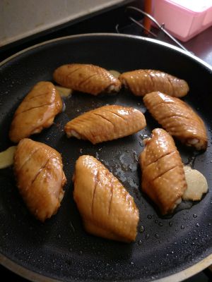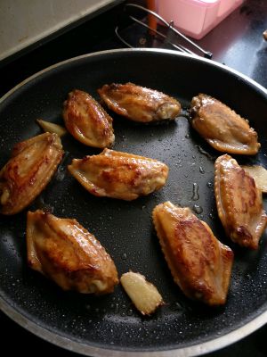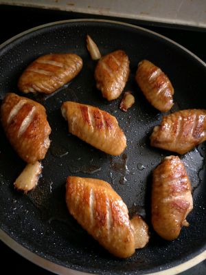 铁锅中放入一层薄薄的底油,下入鸡翅煎至两面金黄