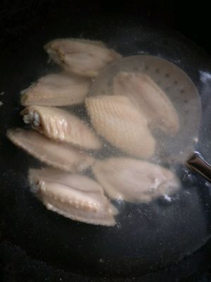 清水烧开 把葱段和姜片放入 再将鸡翅放入焯三分钟后 捞出沥干水分 此步骤目的是除去鸡肉的腥味 也是借助葱姜的味道将鸡翅更好的入味