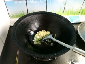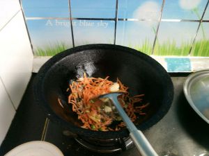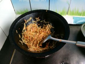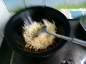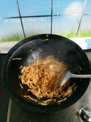 接着把浸泡的土豆丝沥干快速下入锅中翻炒