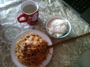 中午炒的酸辣土豆丝派上用场了,脆辣爽口,配上牛肉酱,味道真不错。