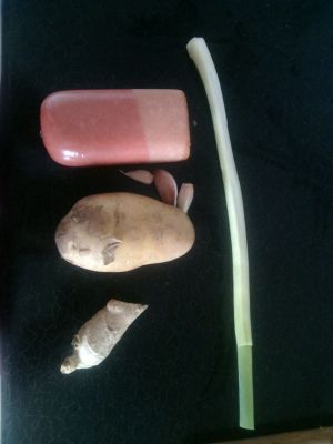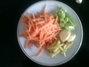 火腿肠切丝,葱切碎,蒜拍扁,姜切丝!