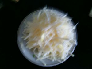 土豆去皮后搽丝,在清水里淘洗两三次,洗干净后的土豆丝在水中加白醋15ml浸泡备用