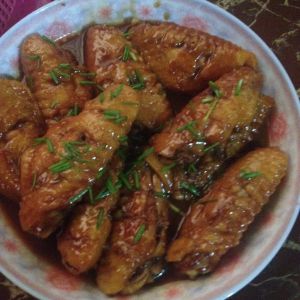 锅热后倒入半瓶可乐,随即将翅根倒入,加老抽,十三香,开锅后转小火,十分钟后大火收汁,加少许盐。