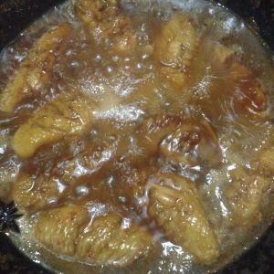 第四步,鸡翅腌好后将葱花去掉 入炸土豆的锅中炸 必要时戴上手套避免油溅到手上 用筷子翻炸 至金黄即可。