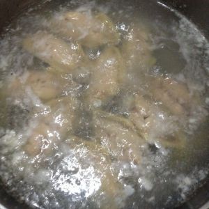 第一步,因为超市买到的鸡翅是冻冰的 先往锅里装满水 把鸡翅倒进去 水开即关火。