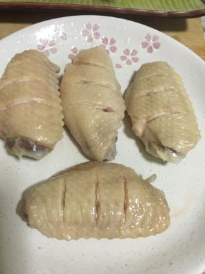 翅根捞出沥净水分,待稍凉,划刀,方便入味;
