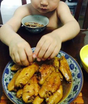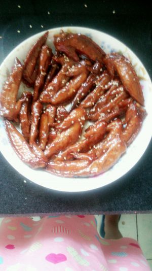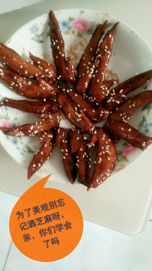 把汤再加地瓜粉水,勾芡,收融汁,淋到鸡翅上面。完成