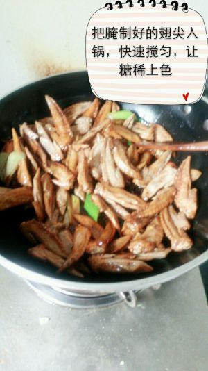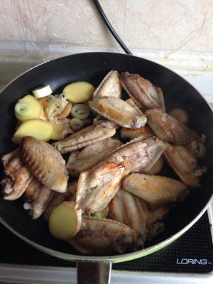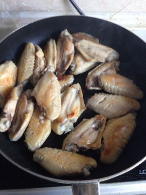 放入鸡翅,将两面煎至焦黄出香味后继续翻炒至肉熟