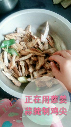翅尖用水焯完,用,葱姜蒜,盐腌制翅尖,大概10分钟吧
