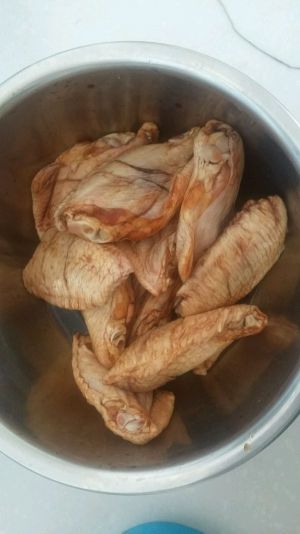 鸡翅洗净,划两个口,放入盐1茶匙,料酒2茶匙,姜粉1茶匙,老抽1茶匙拌匀,腌制1小时;
