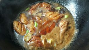 放入葱段和姜片,倒入可乐,加1汤匙料酒,1茶匙老抽,2茶匙生抽,大火烧开后转小火,至收汁即可。