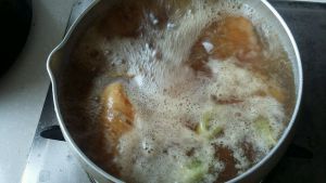 锅中倒入可乐,酱油,醋。(由于吃的甜,还多加了点糖)还撒了点盐和五香粉,可以不放。