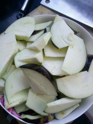 茄子切片,放少许盐拌匀,茄子腌制0分钟左右,挤出水份