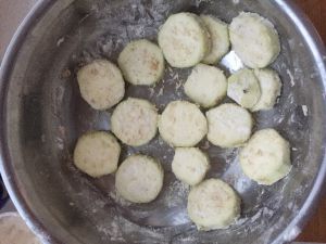 茄子洗净去皮,切块,撒盐、十三香、面粉拌匀